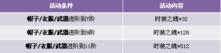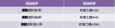 【活动内容】活动期间,玩家时装升阶到7、9、11阶,可获得奖励时装之魄。升阶翅膀提升战力,成就一代战将之王!