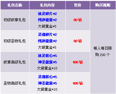 【活动内容】活动期间,纹章圣物材料礼包搭配大袋黄金特价出售,从此紫色品质纹章圣物触手可及!