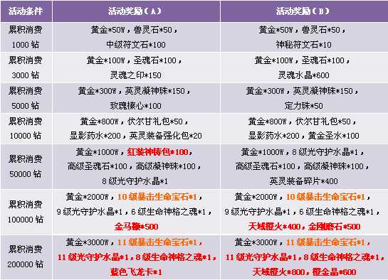 3. 活动期间累计消费满足条件可领取奖励,每重奖励玩家只能领取一次, 请留意领取活动奖励。