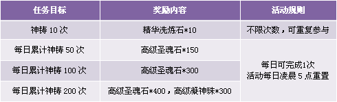 【活动描述】活动期间,玩家神铸达到指定要求即可获得丰厚奖励。打开商城“限时热卖”即可购买神铸道具,超值奖励轻松享有!赶快行动吧!