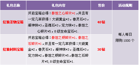 【活动内容】活动期间,红装圣物宝箱和红装材料宝箱齐齐上架游戏商城,机会不容错过。