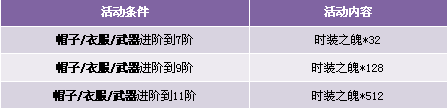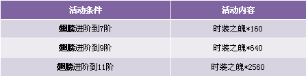 【活动内容】活动期间,玩家时装升阶到7、9、11阶,可获得奖励时装之魄。升阶翅膀提升战力,成就一代战将之王!