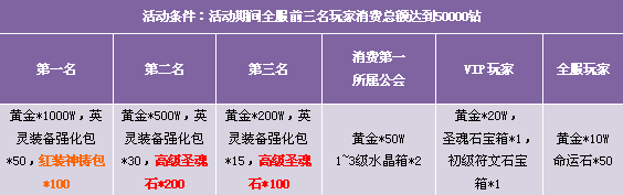 1. 每天全服消费前3名玩家,3名玩家共同消费满5W钻,方可领取奖励;