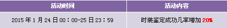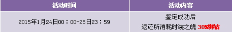 【活动内容】活动期间,商城上架时装之魄以及打折时装,时装鉴定成功几率增加20%,且以绑钻形式返还30%的鉴定费用。提战力好时机,时装鉴定轻松享受。