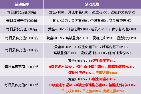 1. 每日累积充值达到1000钻石可同时获得累积充值1000和500档次的两重奖励,依此类推;