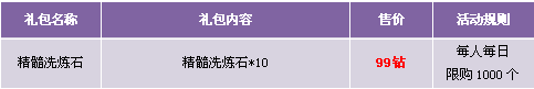 【活动内容】活动期间,精髓洗炼石商城限时出售,红装洗炼不用愁!