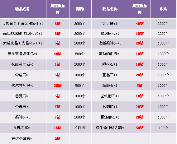 1. 礼包仅在商城“限时热卖”处出售,道具仅限“钻石”购买;