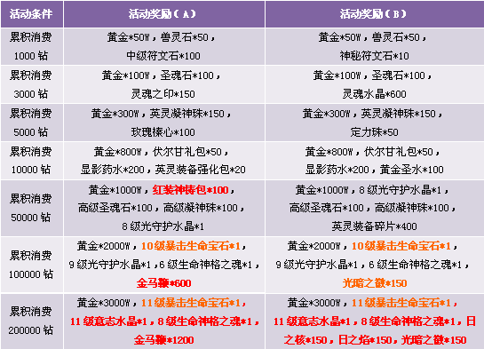 3. 活动期间累计消费满足条件可领取奖励,每重奖励玩家只能领取一次, 请留意领取活动奖励。