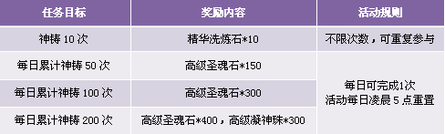 【活动描述】活动期间,玩家神铸达到指定要求即可获得丰厚奖励。打开商城“限时热卖”即可购买神铸道具,超值奖励轻松享有!赶快行动吧!