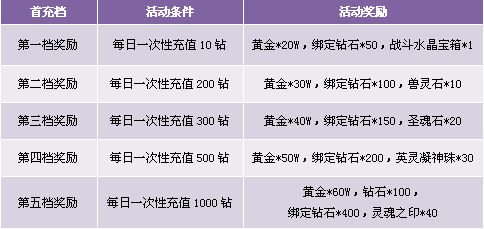 1. 每日首次充值10钻以上即可获得第一档奖励,领完本档奖励可充值参加下一档活动,第二次一次性充值200钻以上可以获得第二档奖励,以此类推,一次充值达到条件领取对应档礼包一份;