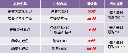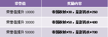 【活动内容】荣耀的帝国,战士们孜孜以求无尚荣誉,活动期间,荣誉值提升指定数即可获得丰厚奖励。