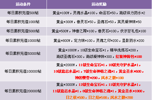 【活动内容】在活动期间内每日累积消费达到指定条件,即可获得前所未有的宝石和水晶大礼!
