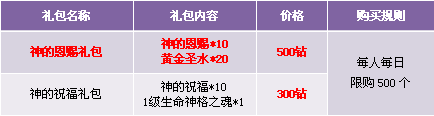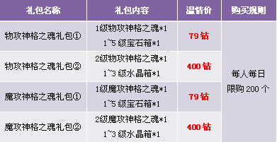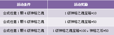 【活动内容】活动期间,商城上架神格之魂礼包,合成指定神格之魂,可获得相应奖励。