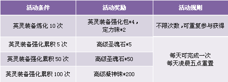 【活动内容】活动期间,炼化、强化英灵装备达到指定次数,即可获得相应奖励。铸就属于你的极品英灵装备,打造新一代英灵王中王。
