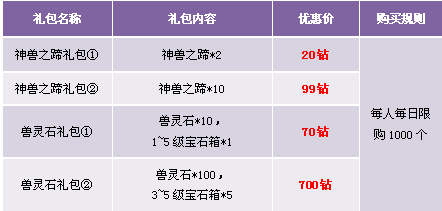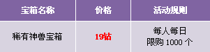 【活动内容】活动期间,商城上架稀有神兽宝箱,开启宝箱可获得稀有神兽碎片,稀有神兽碎片可在精彩活动处兑换相应坐骑。