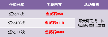 1. 钻石培养坐骑100次不限次数,累积培养坐骑至1000次、2000次、4000次、6000次,每次可完成一次,活动次数每天凌晨5点重置,请留意领取奖励,奖励皆为绑定;