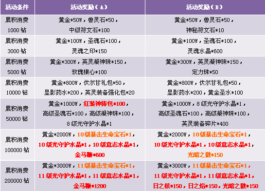 3. 活动期间累计消费满足条件可领取奖励,每重奖励玩家只能领取一次, 请留意领取活动奖励。
