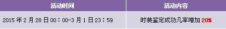 【活动内容】活动期间,商城上架时装之魄以及打折时装,时装鉴定成功几率增加20%,且以绑钻形式返还30%的鉴定费用。提战力好时机,时装鉴定轻松享受。更有高级时装宝箱上架,仅售20钻/个,各式时装等你来换!