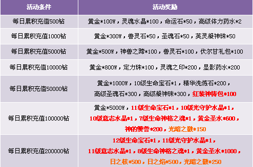 1. 每日累积充值达到1000钻石可同时获得累积充值1000和500档次的两重奖励,依此类推;