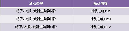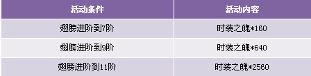 【活动内容】活动期间,玩家时装升阶到7、9、11阶,可获得奖励时装之魄。升阶翅膀提升战力,成就一代战将之王!