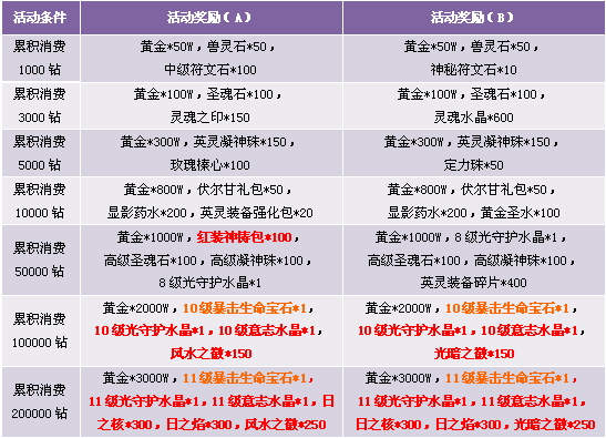 3. 活动期间累计消费满足条件可领取奖励,每重奖励玩家只能领取一次, 请留意领取活动奖励。