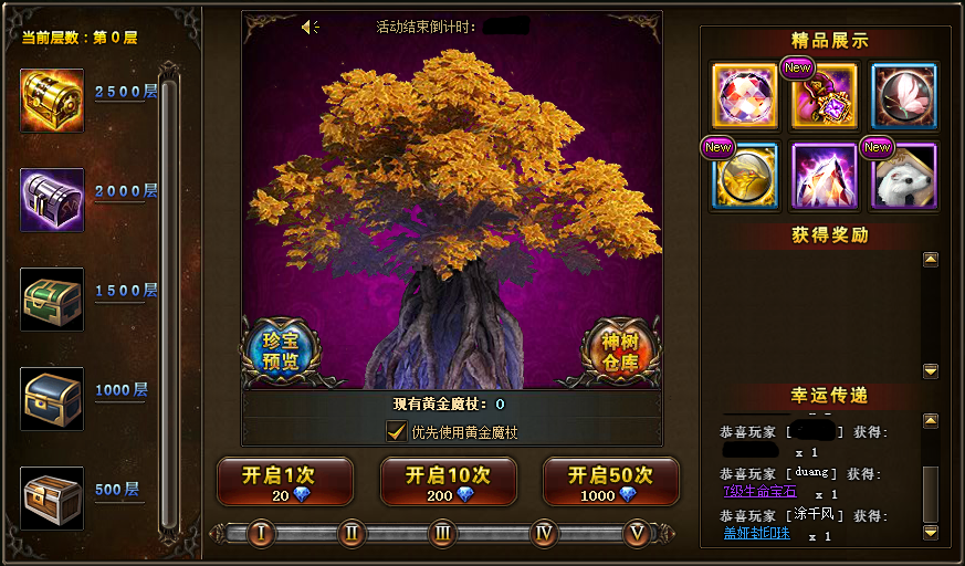 【活动说明】活动期间,单服所有玩家开启神树会累积神树层数,摇到指定层数的玩家可以额外获得一份超级大礼!个人消费奖励的重置时间为凌晨0点。