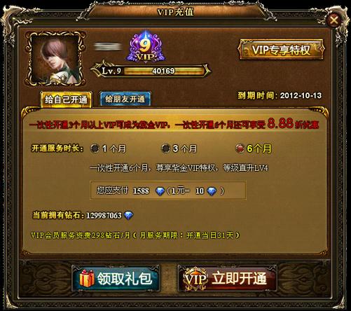 l 玩家点击“背包”或“人物头像”进入“装备界面”,点击“VIP图标“后,开启”VIP界面“则可以直接在此界面有两个开通按钮,一是可以为自己开通VIP功能,成为VIP贵宾用户。同时,也可以帮朋友开通VIP功能。