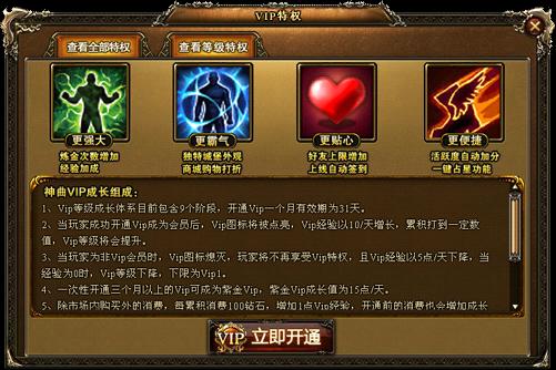 《神曲》推出全新的"VIP系统",玩家们只要通过购买"VIP卡"并使用后开启VIP功能,就可以获得前所未有的游戏体验,并获得VIP专属的、区别于其他玩家的游戏特权!