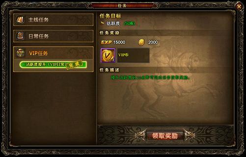 Vip享有专属VIP日常任务。非VIP用户也可以点击查看任务内容,但可进行任务内容,但不可交任务。当玩家在VIP有效期内完成了任务,而后VIP过期了,将不显示VIP的任务的完成状态,再开通VIP以后,将可直接完成。