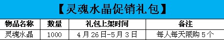 活动内容:在活动期间内,商城将上架优惠促销大礼包,大量灵魂水晶等你抢~别错过哦~