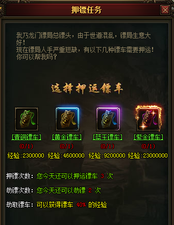 镖局这个行当始终都是刀口舔血的营生,镖车押运之路也充满了危险和未知,需要处处小心、时时警惕,一不留神就有可能倾家荡产,更甚至性命不保,因而勇于承接押镖任务的玩家都是真正的英雄!玩家在完成副本等任务时会有一定几率获得镖令,当玩家拾取镖令后,便可以前往无双城承接押镖任务,每位玩家每天可以领取镖车3次。