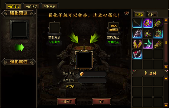熔炉系统分为装备强化和材料合成,以及装备转移。