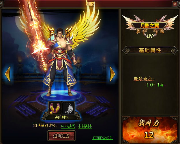 ·进阶时需要消耗相应等级羽毛(例如3级翅膀进阶4级时候需要消耗4级羽毛) 低级羽毛通过材料合成功能可获得高级羽毛。
