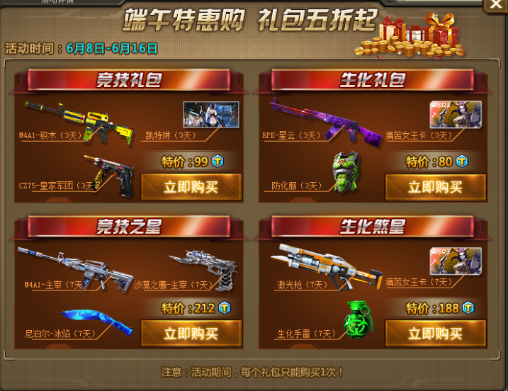 活动期间,每个礼包每人限购1次。