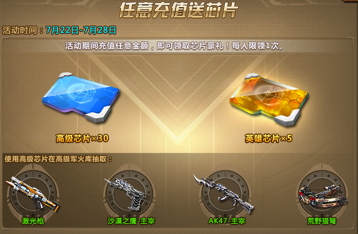 充值任意金额,即可领取30个高级芯片和5个英雄芯片,快去军火库试试运气吧!
