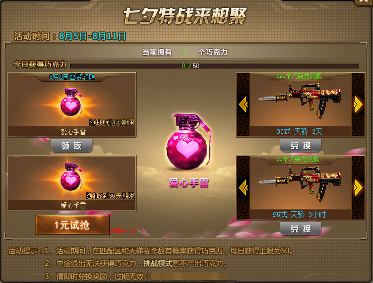 浪漫七夕,来特战相聚!活动期间在匹配区(挑战模式除外)和天梯赛杀敌均有概率获得巧克力,可用于兑换武器奖励。每日获得上限为50,比赛中途退出无法获得巧克力。