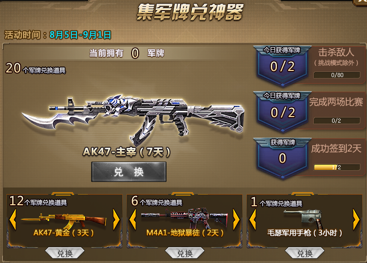 活动期间,每日通过游戏完成任务可收集军牌,军牌可兑换珍贵武器(每个任务最多可获得8枚军牌)。