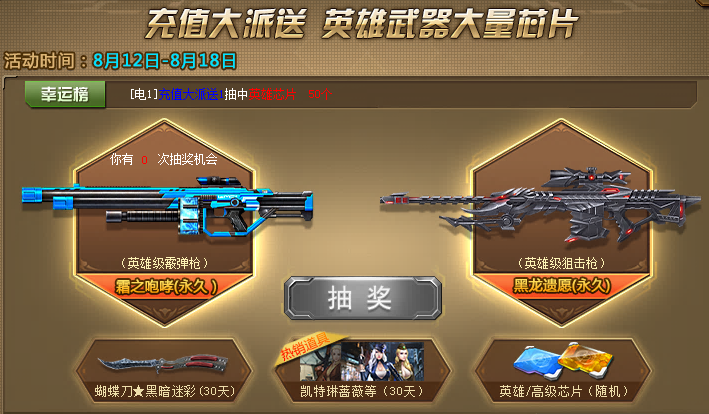 活动期间,每充值100TZ点,可获得1次抽奖机会,抽取大量芯片、热销道具等,更有机会赢取黑龙遗愿(永久)、霜之咆哮(永久)!