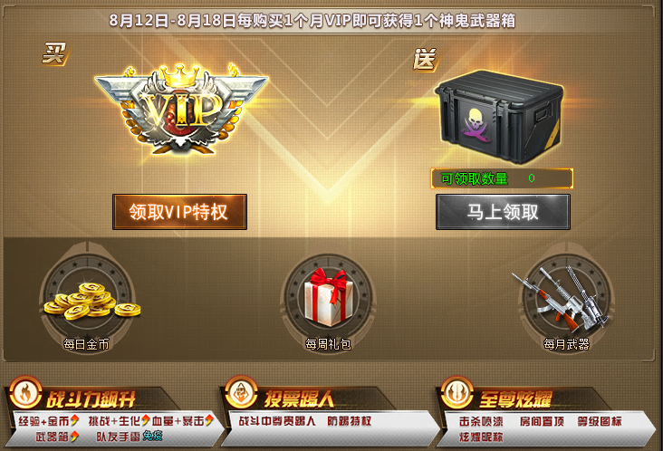 活动期间,每购买1个月的VIP,即可领取1个神鬼武器箱,有机会开出绝版永久武器AN94美杜莎、M4A4-波塞冬和爪子刀-渐变冷钢哦!