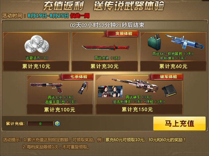充值送传说套装武器体验,超值福利不可错过!累计充值达到指定数额可领取奖励,例如累充60元可领取10元、30元和60元的奖励。每档奖励限领1次。