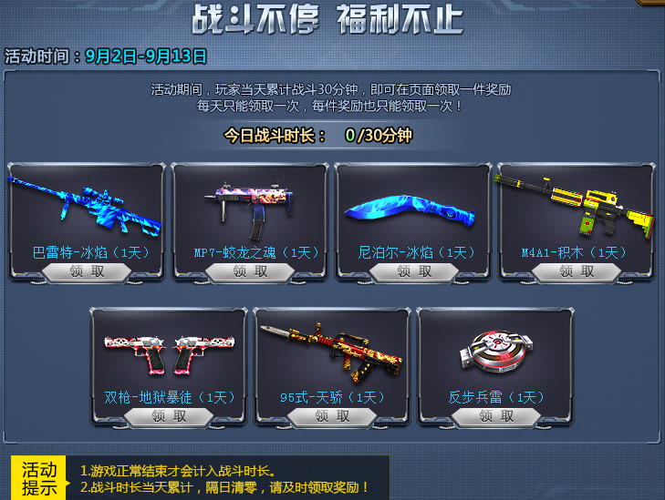 活动规则:战斗不停福利不止,七件神器等你拿!活动期间,当天累计战斗30分钟,即可领取一件奖励。每天限领取一次,每件奖励也只能领取一次。