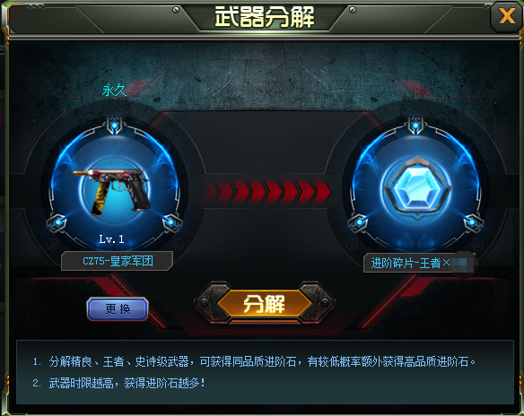 3. 武器分解功能上线,通过分解武器可以获得进阶碎片。