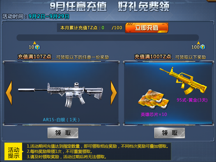 活动规则:9月任意充值,好礼免费领。充值1元,即可领取超值时限武器奖励;充值满10元,更有黄金武器大礼!快来参与吧~