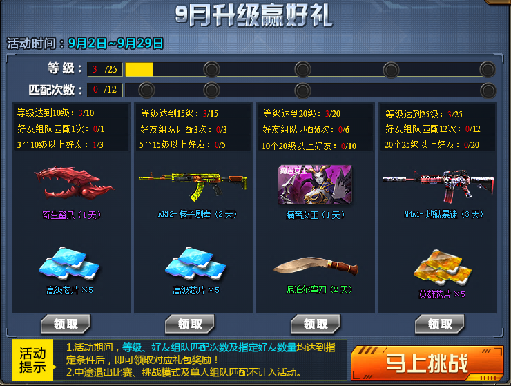 活动规则:活动期间,等级、好友组队匹配次数及指定等级的好友数量达到一定条件后,可领取大礼。