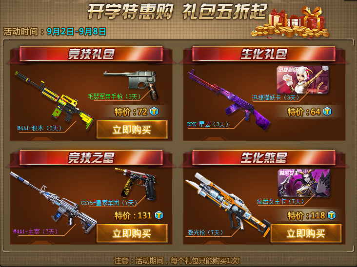 活动规则:4种特惠礼包,包含竞技和生化模式的热门武器,只需五折。购买礼包比单独买主武器更便宜,仅此一周不可错过!