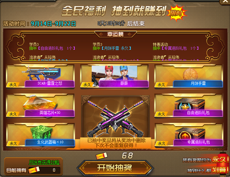 ② 抽奖需要消耗月饼券。月饼券可以通过“来战就送月饼券”、“任意充值送月饼券”活动获得,也可以在礼包中花费TZ点补全。