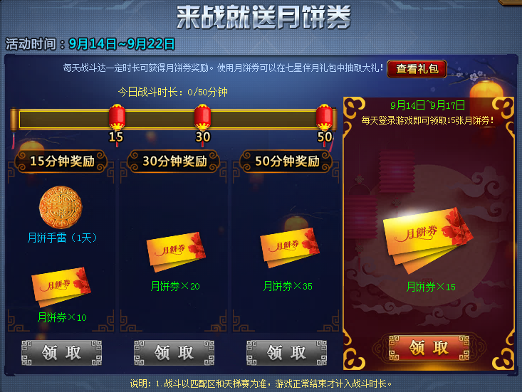 活动规则:每天通过战斗一定时长可以获得月饼券,用于七星伴月礼包抽奖。9月14日~9月17日每天登录还可以在活动面板领取额外的月饼券奖励!