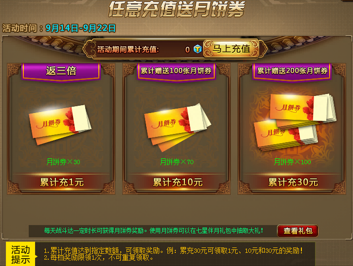 活动规则:充值任意金额,即可获得30个月饼券。累计充值满10元和30元,还有更多月饼券奖励!月饼券用于七星伴月礼包抽奖。