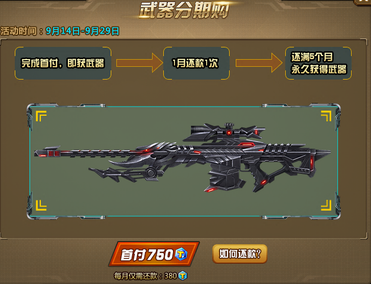 (3)首付750TZ点,每月还款380TZ点即可获得永久史诗武器;