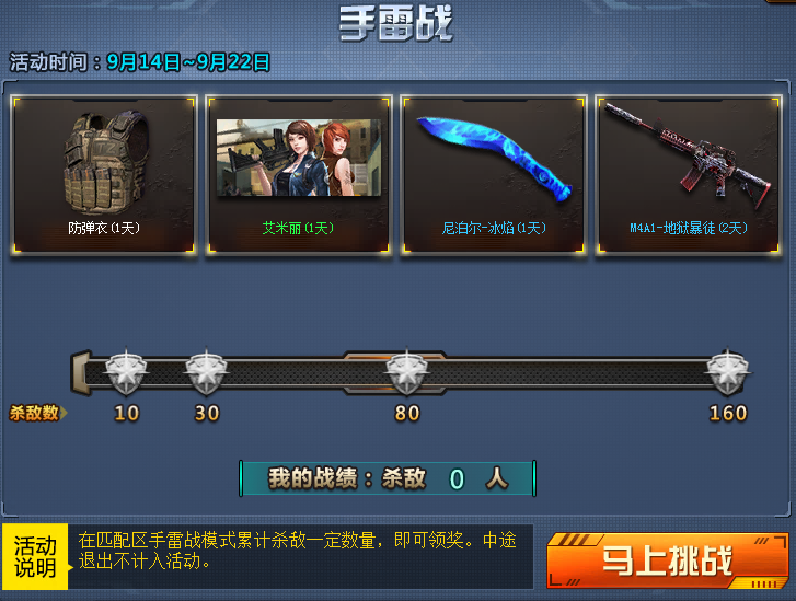 活动规则:活动期间匹配区上线手雷战模式。在匹配区手雷战模式累计杀敌达到一定数量,即可领奖,中途退出不计入活动。